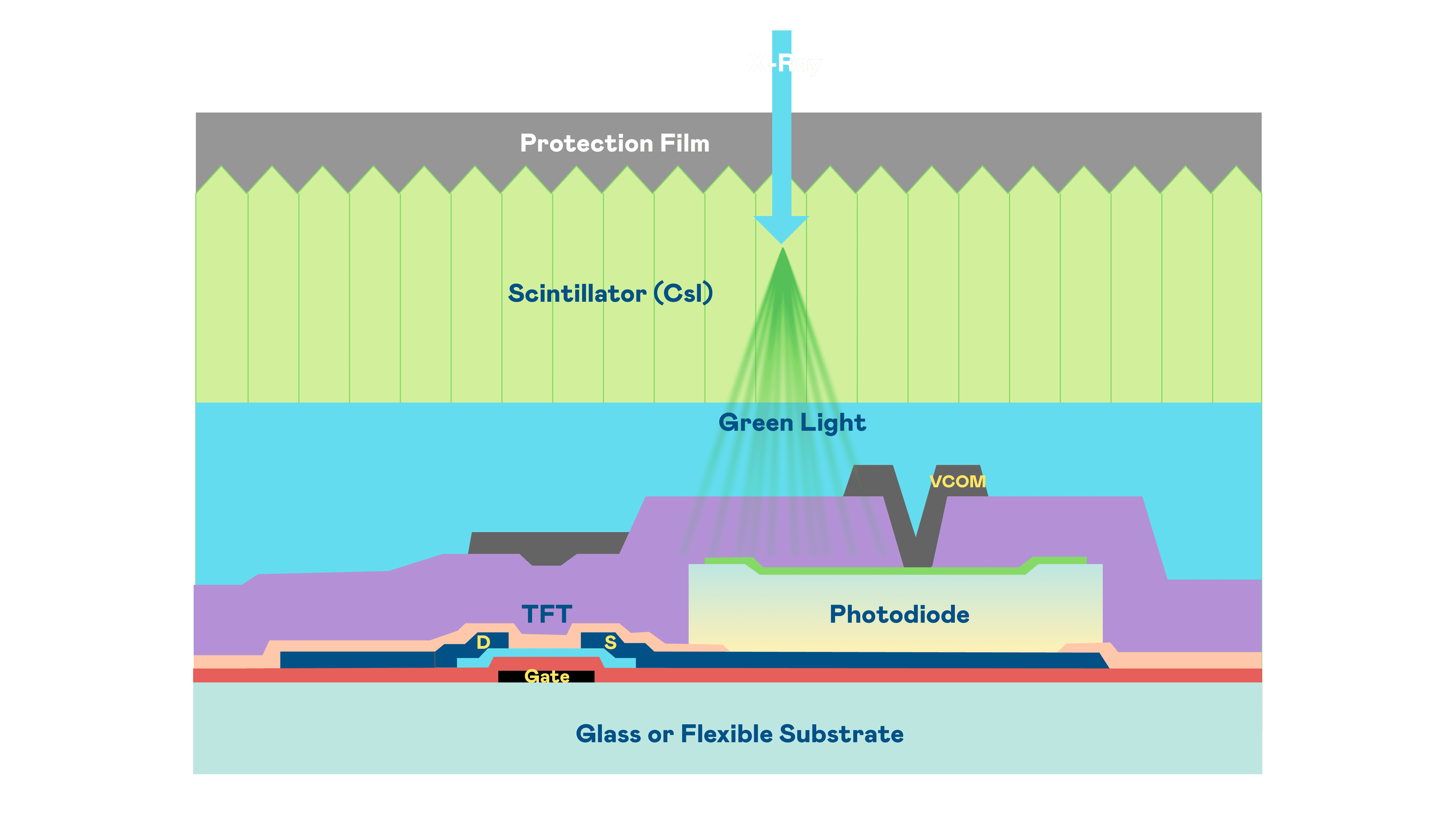尊时凯龙的X光影像感测阵列使用薄膜电晶体 (TFT) 作为每个像素的读取开关,,,,搭配光电二极体(Photodiode)的光电转换元件,,,用以感测X光影像讯号。。
